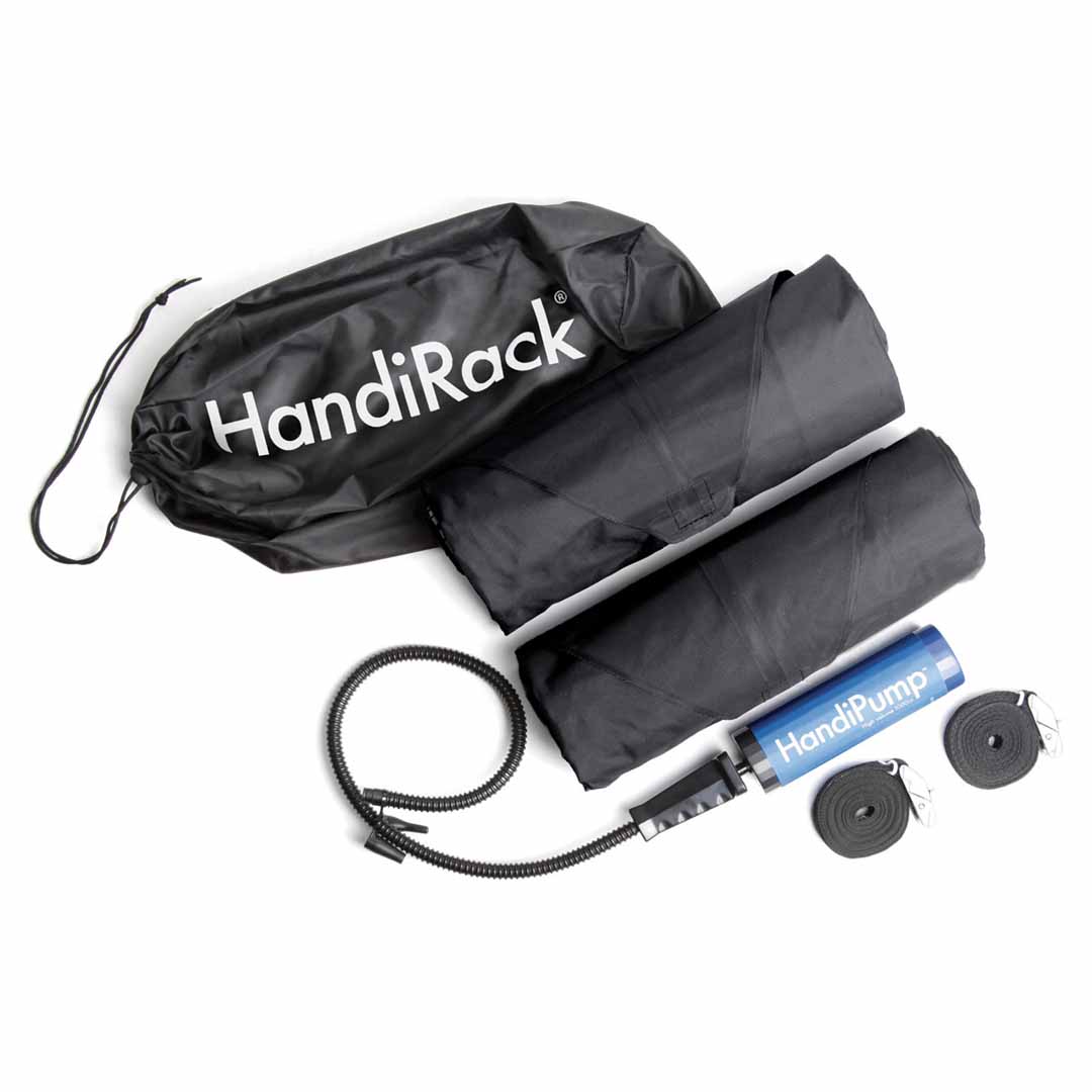 To safely secure your load, each set of bars features 5 metal ‘D’ ring anchor points. A set of 2 x 3 metre HandiStraps, a HandiPump and a drawstring travel bag are all included. The HandiRack is made from strong 400D nylon and each PVC bladder is rigorously tested during production.