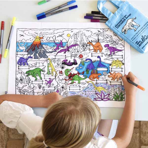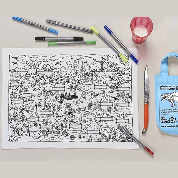 This fun color-in placemat comes in its own mini tote bag with ten colorful wash-out markers. Kids can learn about the dinosaurs as they color in this cool placemat featuring our color-in dinosaur drawing on one side and a notepad print on the other. Whenever they’re ready, wash the placemat on a warm machine cycle, the ink completely disappears, and it’s ready to be re-colored and re-discovered – it makes the best gift for dinosaur lovers!