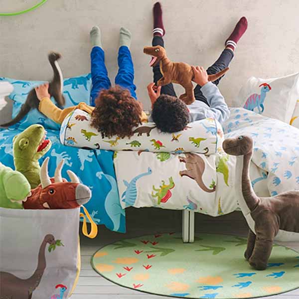 This colourful storage bag with colourful dinosaurs is perfect for everything from extra pillows and duvet to seasonal clothing. Made from recycled polyester and easy to lift thanks to the sturdy handles. Practical, freestanding storage bag in which you can hide everything from toys and sports items to laundry. Easy for your child to lift and move, since it has handles on both sides. Press together when not in use to save space. Tested and contains no substances, phthalates or chemicals that can harm your child’s skin or health.