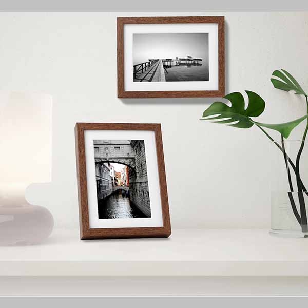 Puedes elegir cómo enmarcar tus fotos: en la parte anterior o en la posterior, con el accesorio interior, y con o sin paspartú. Cuélgalo de pie, bien en horizontal o en vertical; se adapta al espacio disponible. Gracias a la protección frontal de plástico, los marcos son más ligeros y seguros.