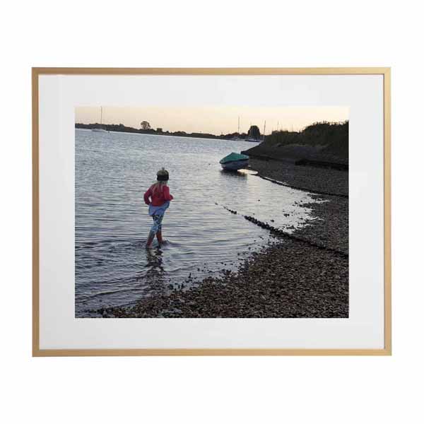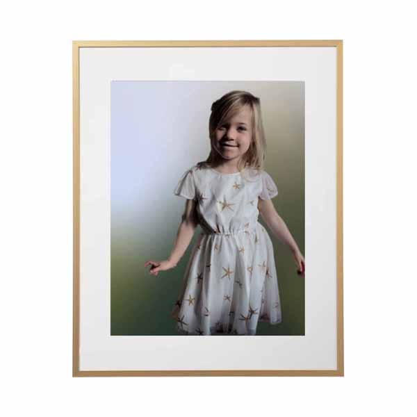 El marco es de aluminio anodizado color oro. El vidrio tiene un protector de poliestireno que proteje la fotografía contra su desteñido. Este marco es compatible con fotos de 30 x 40cm si utilizas el paspartú, y es compatible para fotos de 40 x 50cm si no se utiliza el paspartú.