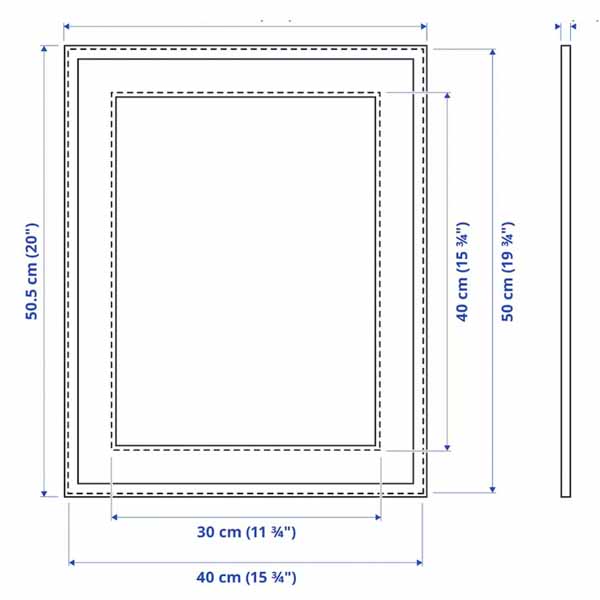 This frame fits with a picture that has dimensions 30×40 cm if you use it with the mount, and it fits with a picture that has dimensions 40×50 cm if you choose to use the frame without the mount.