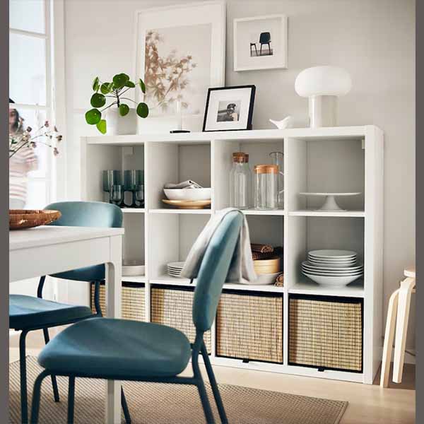 Standing or lying – the KALLAX series adapts to taste, space, needs and budget. Smooth surfaces and rounded corners give a feel of quality and you can personalise the shelving unit with inserts and boxes.