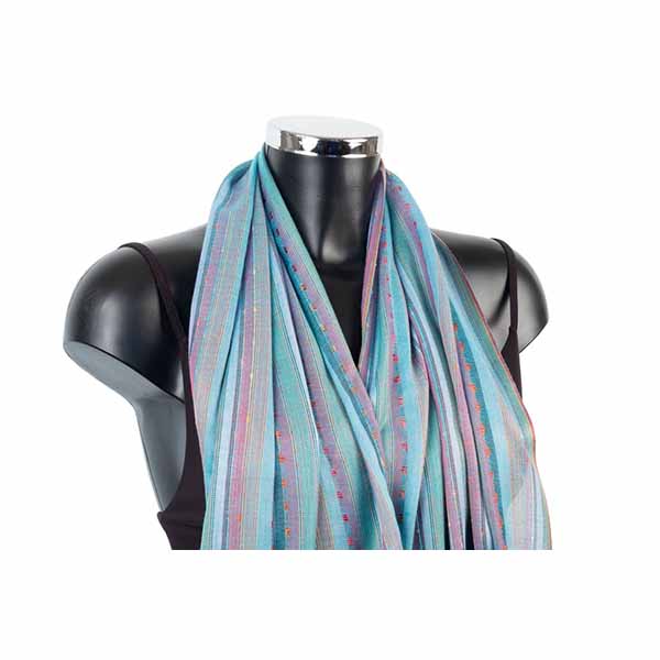 Esta bufanda clásica a rayas, color base es celeste forma parte de nuestra nueva gama de bufandas. Tiene una elegante combinación de colores que las hace versátiles y adaptables para cualquier ocasión.