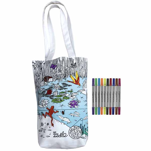 A fun, practical carry bag for books, kit, shopping and more! Better still, it is also both creative and educational. Kids (and adults) can enjoy adding their own colours to the hand-drawn pond life scene with the set of wash-out markers. When ready for a new color scheme, a machine wash and the marker ink disappears completely – endless fun. The tote also looks great as it is – making it a perfect adult shopper too.