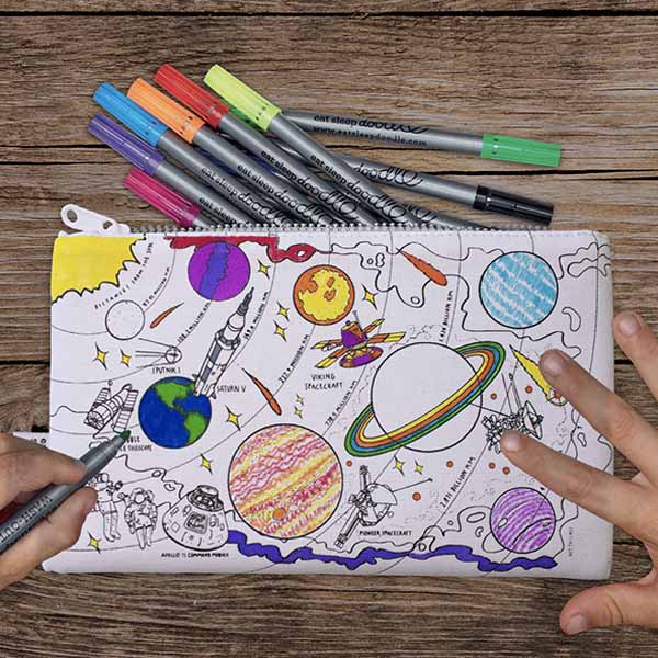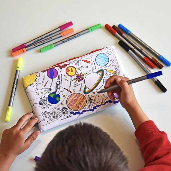 Kids can color and discover the stars, planets and spacecraft in our solar system with this fun color-in space pencil case! Featuring the order of the planets on one side and the historic moon landing scene on the other, there are loads of cool astronauts and rockets all ready to be brought to life with the enclosed pack of ten wash-out markers (which fit neatly inside the case).