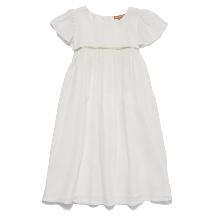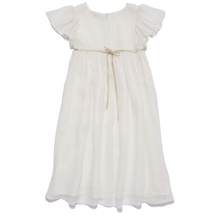 This timeless dress is beautifully detailed with a gold ribbon around the chest and beading on the sleeves. Fastened down the back with a zip. Perfect for bridesmaids, christenings or parties.