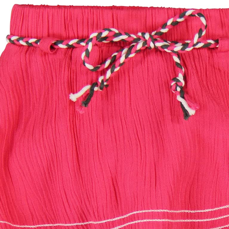 This bright pink crepe skirt with bloomers is perfect for everyday use. With an elasticated waist and a ribbon around the waist.
