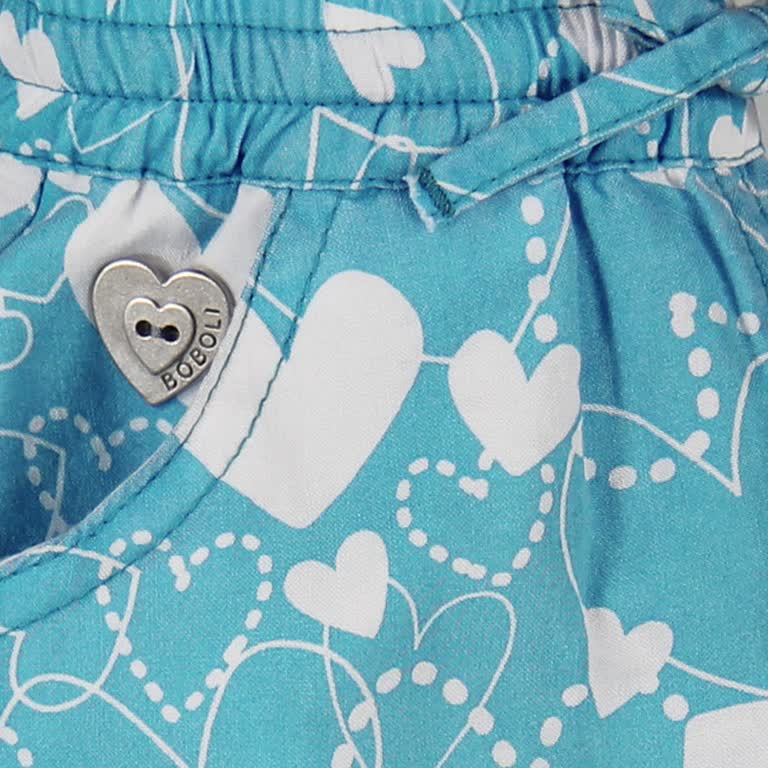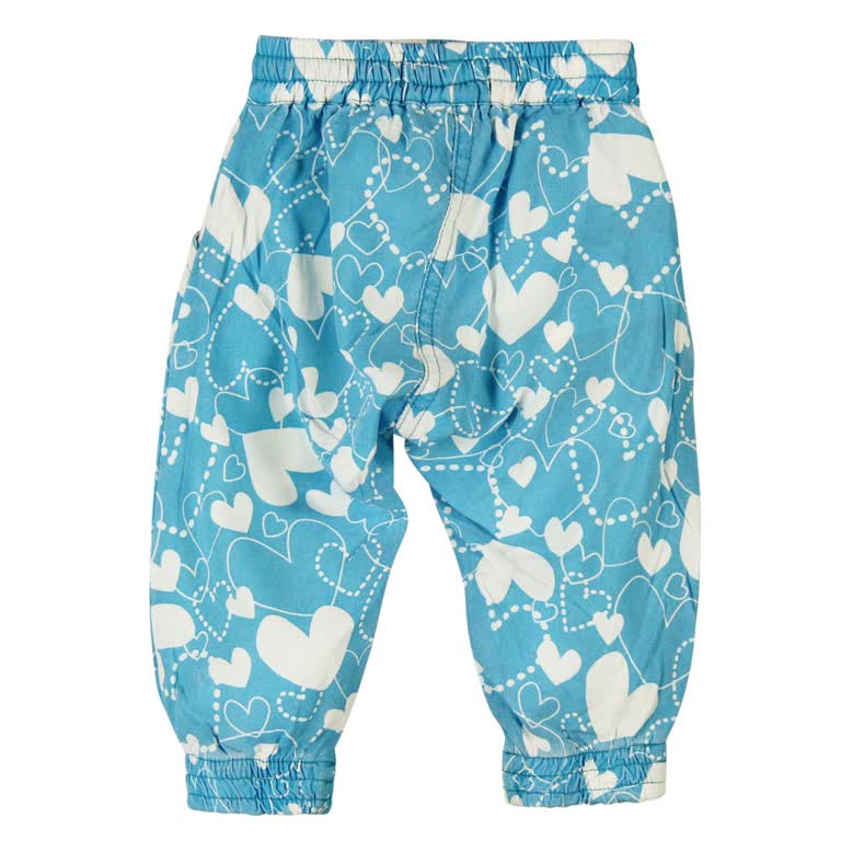 Estos pantalones ligeros de color turquesa cubiertos de corazones blancos son holgados y cómodos para el uso diario o los días calurosos. Con cintura y tobillos elásticos.
